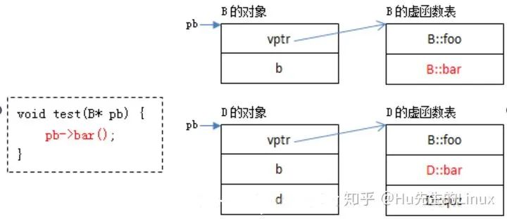 B的虚函数表中存放着B::foo和B::bar两个函数指针。