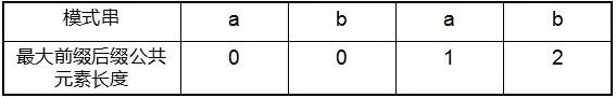 举个例子,如果给定的模式串为“abab”,那么它的各个子串的前缀后缀的公共元素的最大长度如下表格所示: