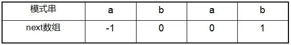 next 数组考虑的是除当前字符外的最长相同前缀后缀,所以通过第①步骤求得各个前缀后缀的公共元素的最大长度后,只要稍作变形即可:将第①步骤中求得的数组整体右移一位,然后第一个元素赋为-1即可(注意:字符串下标需要从0开始),如下表格所示: