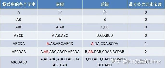 如果给定的模式串是:“ABCDABD”,从左至右遍历整个模式串,其各个子串的前缀后缀分别如下表格所示: