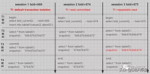 下面针对read committed和repeatable read两种主要的事务隔离模式下的事务快照进行对比测试,例子如下: