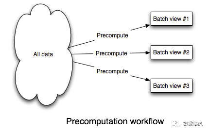 Since a query is a function of all the data, the easiest way to make queries run fast is to precompute them. Whenever there's new data, you just recompute everything. This is feasible because we relaxed the problem to allow queries to be out of date by a few hours. Here's an illustration of this workflow: