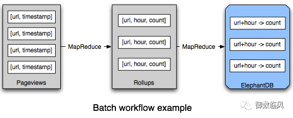 pair and each value is a count of the number of page views. Those key/value pairs are exported into an ElephantDB database so that an application can quickly get the value for any [URL, hour]