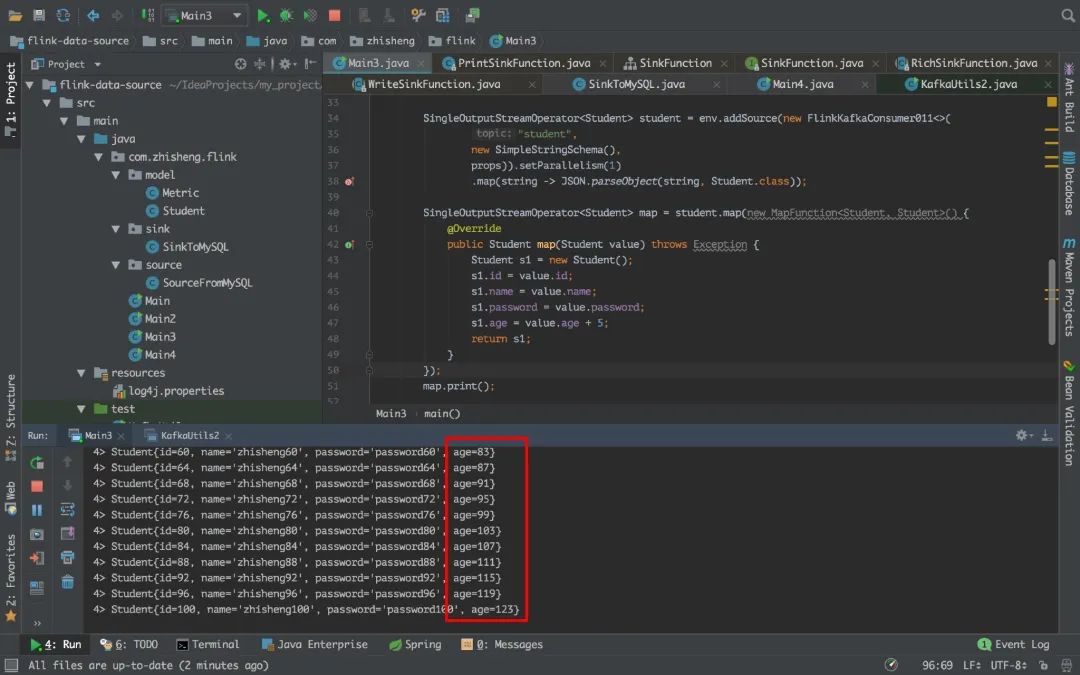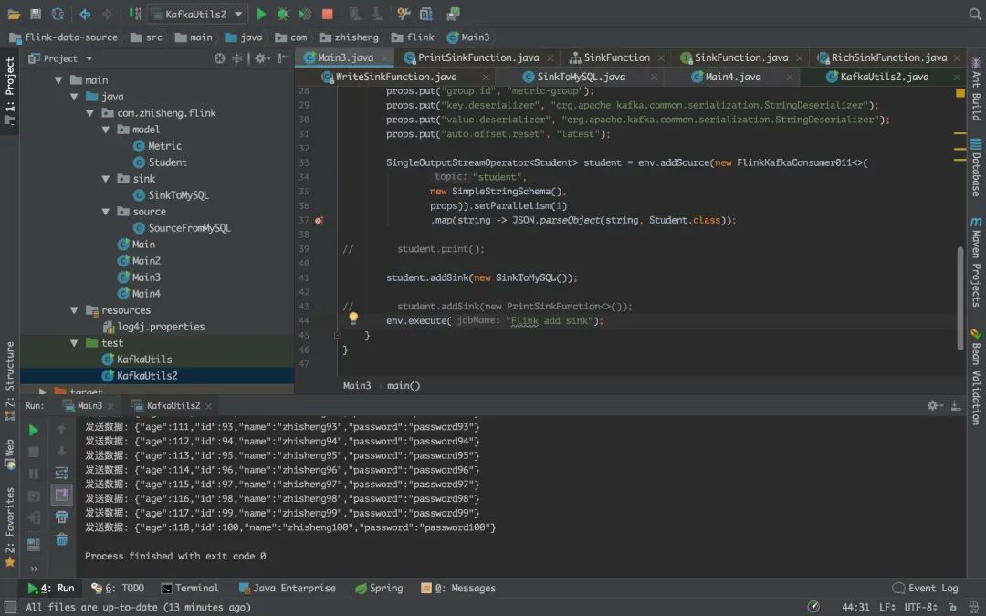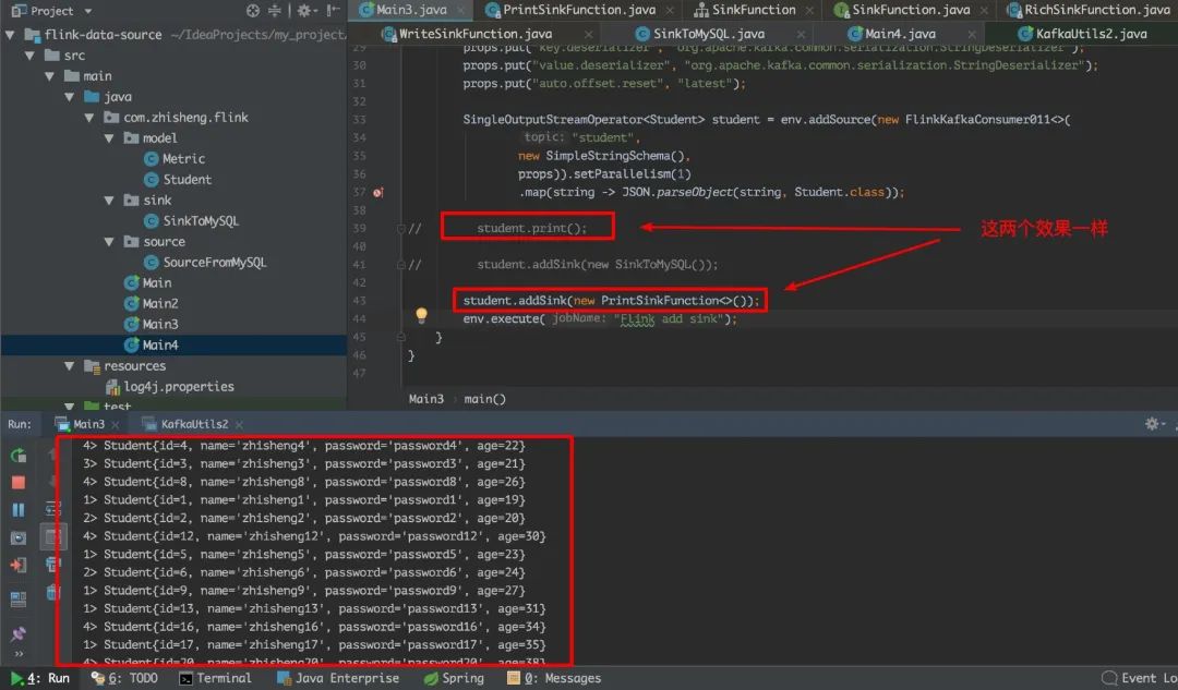 Flink 程序 这里的 source 是从 kafka 读取数据的,然后 Flink 从 Kafka 读取到数据(JSON)后用阿里 fastjson 来解析成 student 对象,然后在 addSink 中使用我们创建的 SinkToMySQL,这样就可以把数据存储到 MySQL 了。