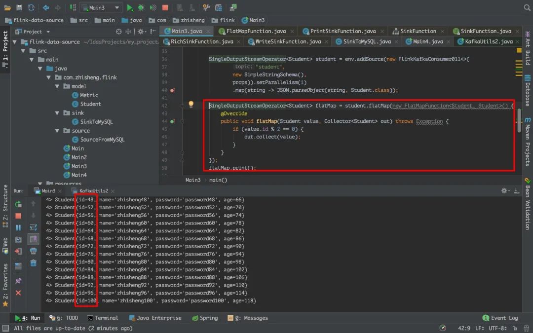 1 2 3 4 5 6 7 8 9 SingleOutputStreamOperator<Student> flatMap = student.flatMap(new FlatMapFunction<Student, Student>() { @Override public void flatMap (Student value, Collector<Student> out) throws Exception { if (value.id % 2 == 0 ) { out.collect(value); } } }); flatMap.print();