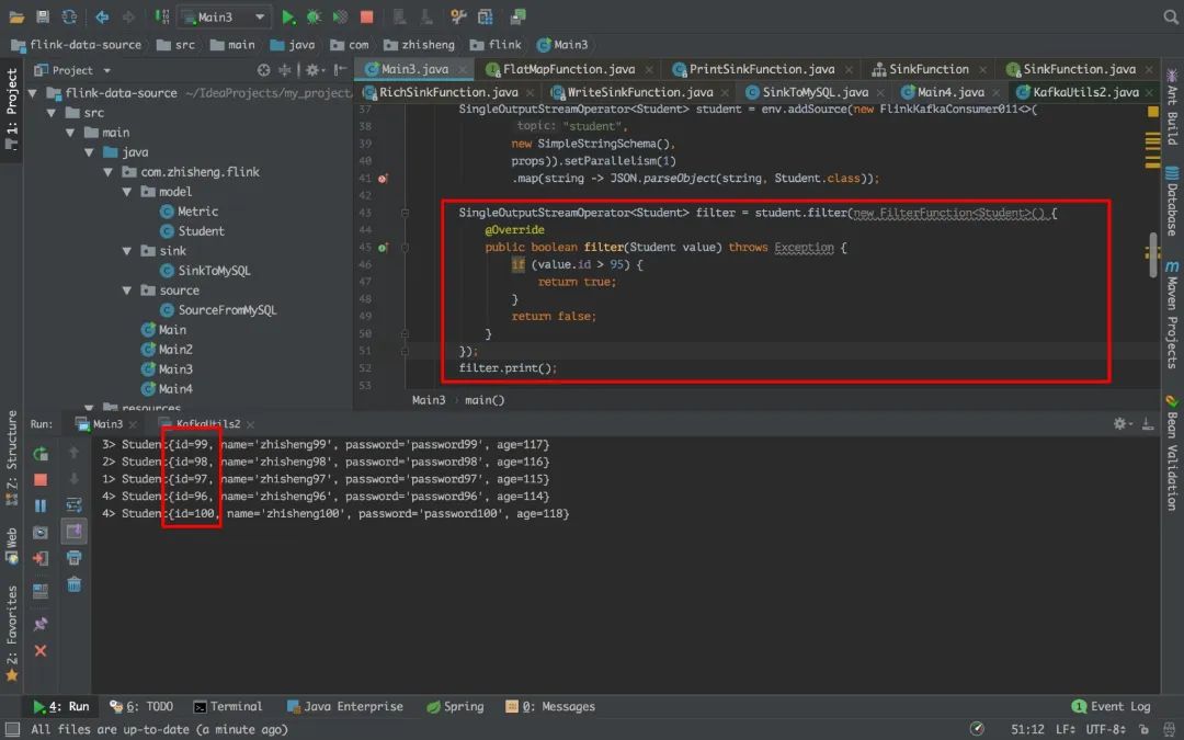 1 2 3 4 5 6 7 8 9 10 SingleOutputStreamOperator<Student> filter = student.filter(new FilterFunction<Student>() { @Override public boolean filter (Student value) throws Exception { if (value.id > 95 ) { return true ; } return false ; } }); filter.print();