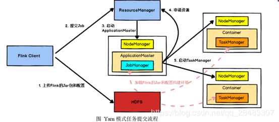 之后向 YarnResourceManager 提交任务, ResourceManager(YARN的资源管理器) 分配 Container 资源并通知对应的NodeManager 启动 ApplicationMaster, ApplicationMaster 启动后加载hdfs上的 Flink 的 Jar 包和配置构建环境