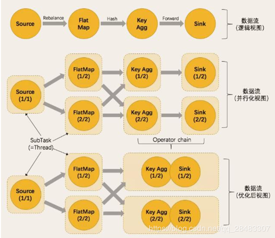 在执行过程中,一个流( stream) 包含一个或多个分区( stream partition) ,而每一个算子( operator)可以包含一个或多个子任务( operator subtask) ,这些子任务在不同的线程、不同的物理机或不同的容器中彼此互不依赖地执行。