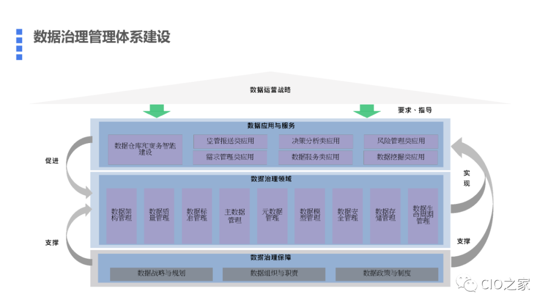 一个完整数据治理体系,应包含数据运营的战略,并在战略的指导下构建和设计数据应用与服务体系,数据治理管理领域,数据治理的保证体系等。
