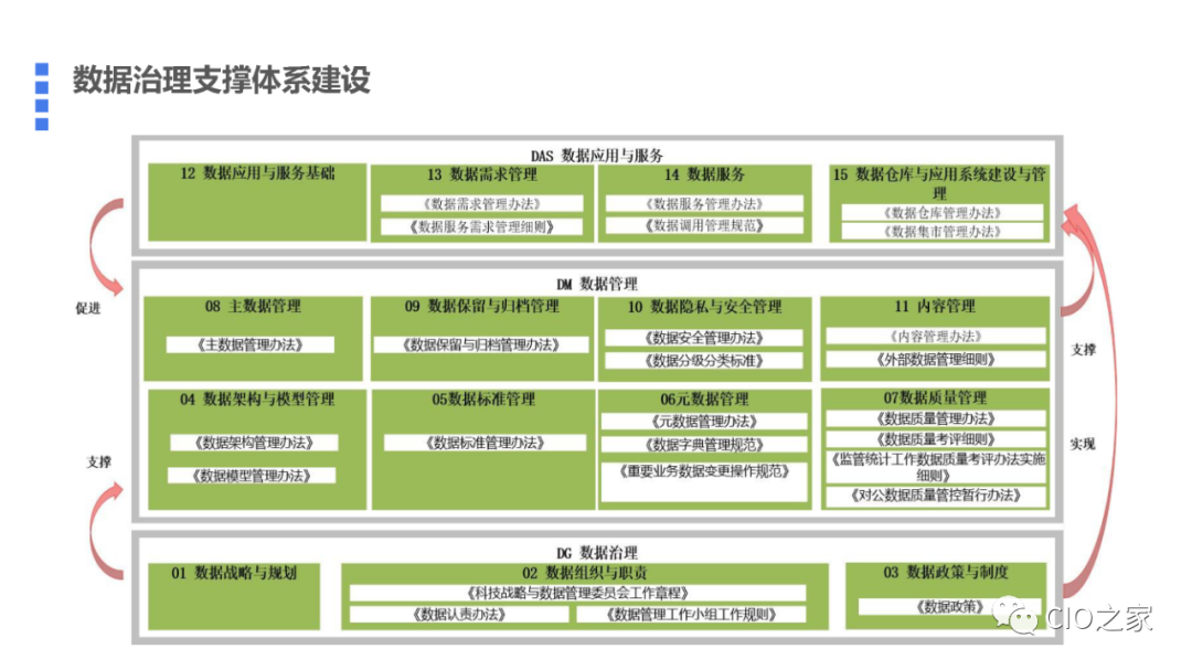 数据治理支持保证体系包括数据治理的组织体系,遵从的政策法规,管理制度,管理流程等。