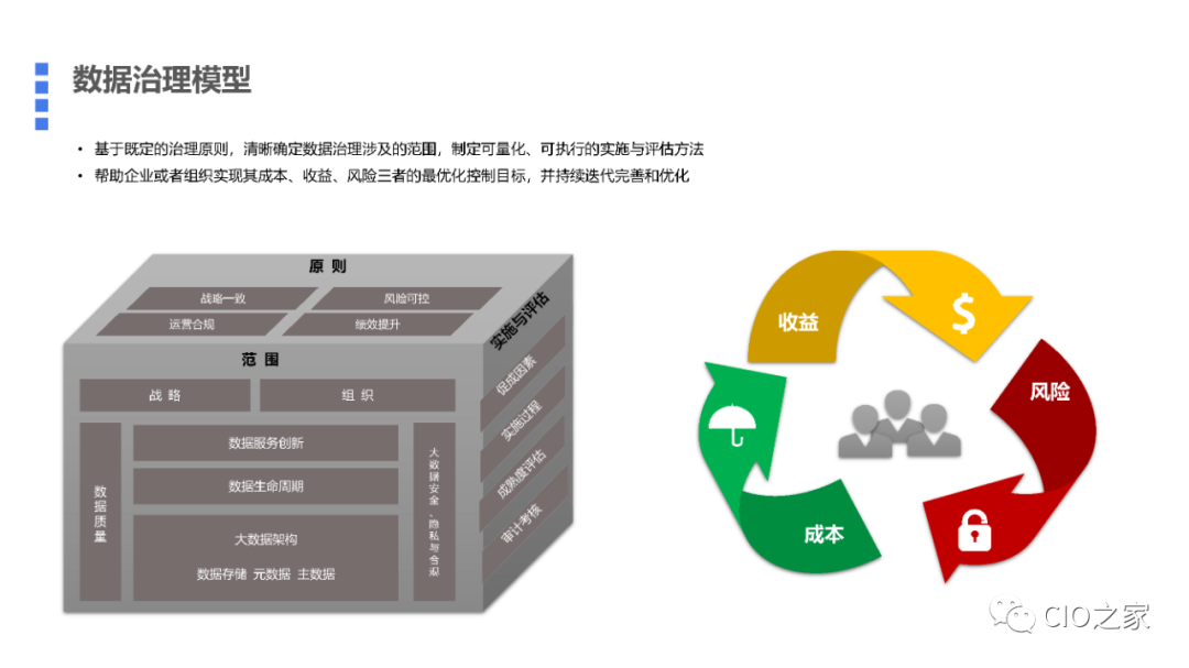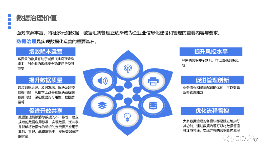 每个企业的数据治理都不是为了治数而治数,背后都是对业务目标的支撑,例如:增效、降本、提质、控险,共享、创新、优化。