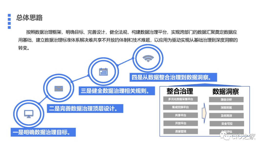 数据治理思路可以分为四步走:一是明确数据治理的目标。二是完善数据治理的顶层设计。三是健全数据治理的相关规则。四是从数据整合治理到数据洞察。