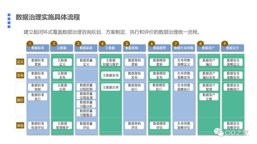 从数据治理专业领域分,数据治理包括数据标准管理、元数据管理、数据质量管理、主数据管理、数据架构、数据模型、数据生命周期管理、数据资产管理和数据安全管理。一个专业领域都需要一套与企业现状和需求相符的数据管理流程。