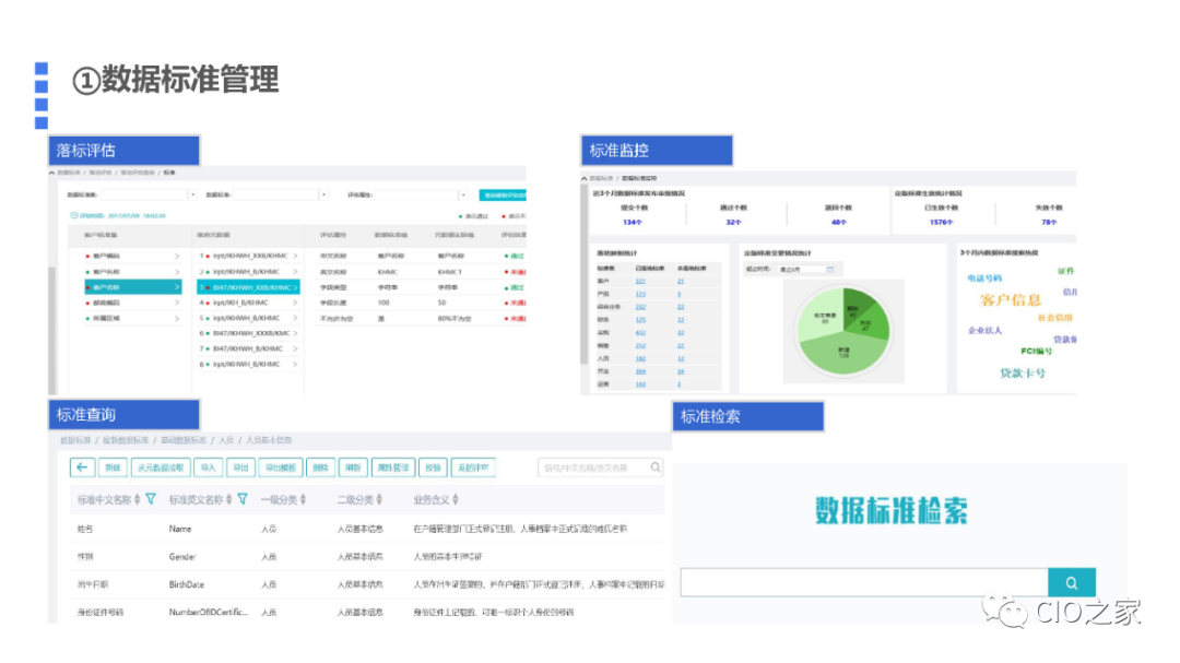 数据标准管理的关键在于梳理数据标准范围,定义数据标准项。功能层面应提供数据标准查询、数据模型监控、数据标准落地评估等功能。