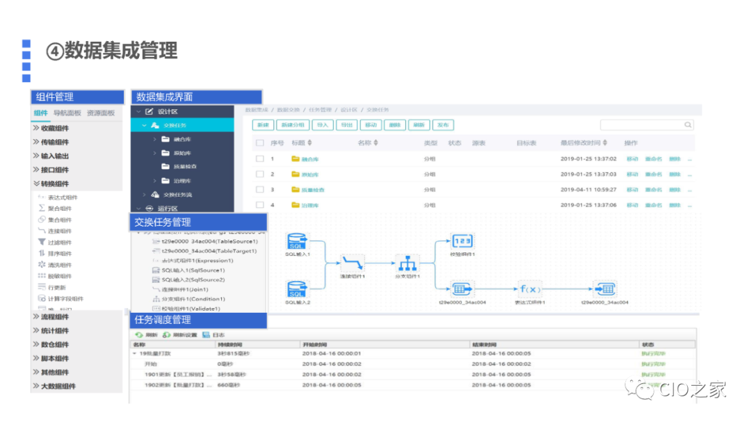 数据集成管理是让数据用起来的重要手段,通过集成工具实现数据的采集、转换、清洗,统一汇集到数据中台形成企业数据资产。