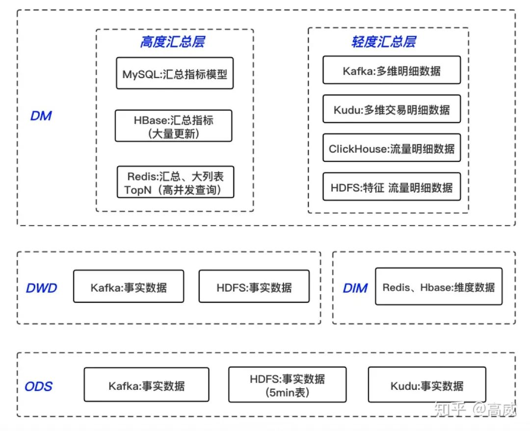 DWD:事实表(data warehouse detail) 数据仓库明细表,以业务过程作为建模驱动,基于每个具体的业务过程特点,构建最细粒度的明细层事实表。 DWS:事实表 (data warehouse summary) 数据仓库轻度汇总层,按照各个业务域进行轻度汇总成分析某一个主题域的服务数据,一般是宽表。 DIM:维度表,公共维度层,基于维度建模理念思想,建立整个业务过程的一致性维度,主要使用 MySQL、Hbase、Redis 三种存储引擎,对于维表数据比较少的情况可以使用 MySQL,对于单条数据大小比较小,查询 QPS 比较高的情况,可以使用 Redis 存储,降低机器内存资源占用,对于数据量比较大,对维表数据变化不是特别敏感的场景,可以使用HBase 存储。