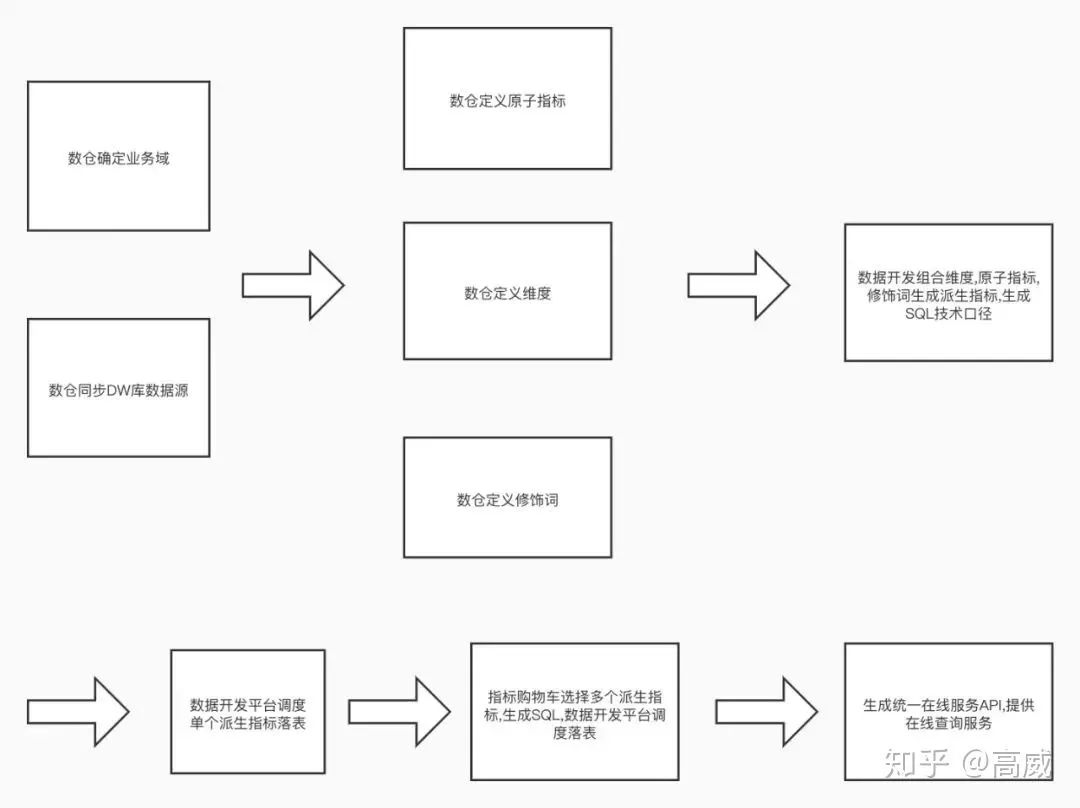 通过设置指标的组成要素来唯一精确定义每个指标(派生指标)。 通过指标在业务域内唯一的性质,解决指标重复定义,重复开发,部分数据对不上的问题。 通过将数仓中间层录入指标库为新制作指标提供指导性的 SQL 或库表推荐。 打通其他各数据平台: 打通数据开发平台和统一数据服务平台,为指标的定义,调度,在线使用提供一条龙服务,简化开发流程。 打通数据资产管理平台,沉淀指标的资产价值。 打通 BI 平台,提供拖拽维度,指标生成报表的功能。