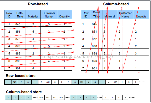 由于OLAP查询的特点,列式存储可以提升其查询性能,但是它是如何做到的呢?这就要从列式存储的原理说起,从图1中可以看到,相对于关系数据库中通常使用的行式存储,在使用列式存储时每一列的所有元素都是顺序存储的。由此特点可以给查询带来如下的优化: