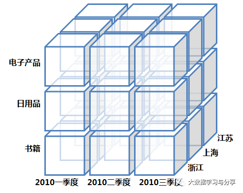 切块(Dice):选择维中特定区间的数据或者某批特定值进行分析,比如选择2010年第一季度到2010年第二季度的销售数据,或者是电子产品和日用品的销售数据。