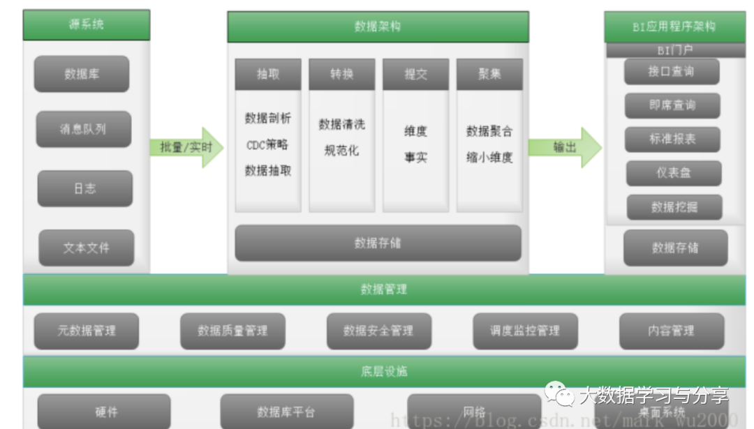 数据仓库的核心功能从源系统抽取数据,通过清洗、转换、标准化,将数据加载到BI平台,进而满足业务用户的数据分析和决策支持。数据仓库架构包含三个部分:数据架构、应用程序架构、底层设施。