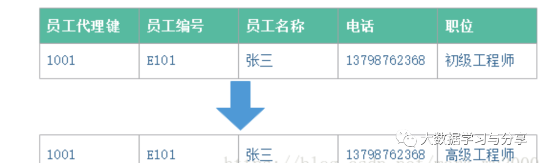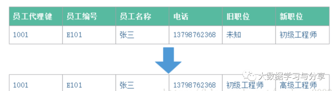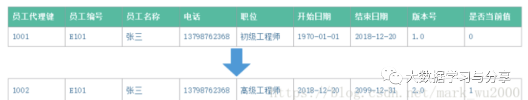 字段值发生变化时会新增一行,重新分配代理键,每一行添加开始日期,结束日期,版本号,是否当前值。