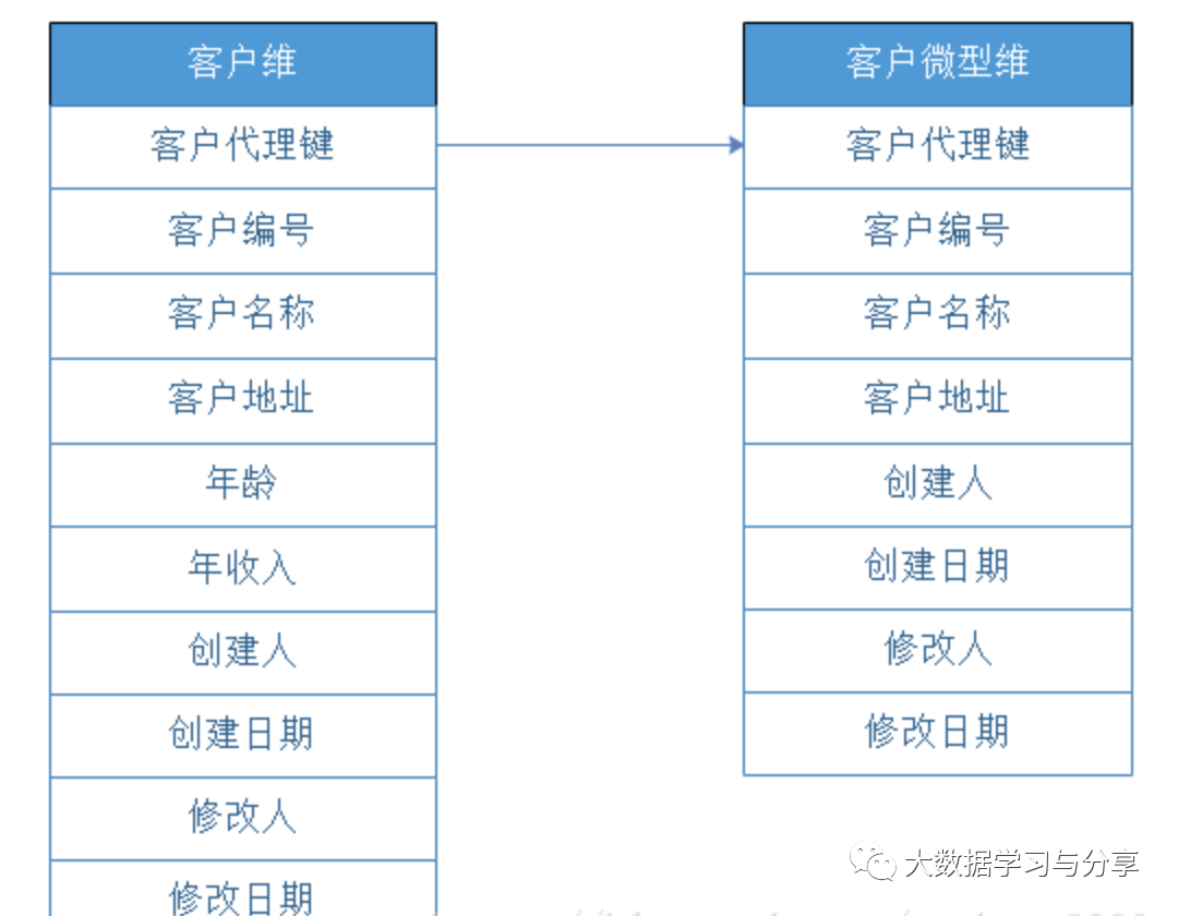 一个大型维有些属性变化比较频繁,把这些属性单独生成一个微型维度表。