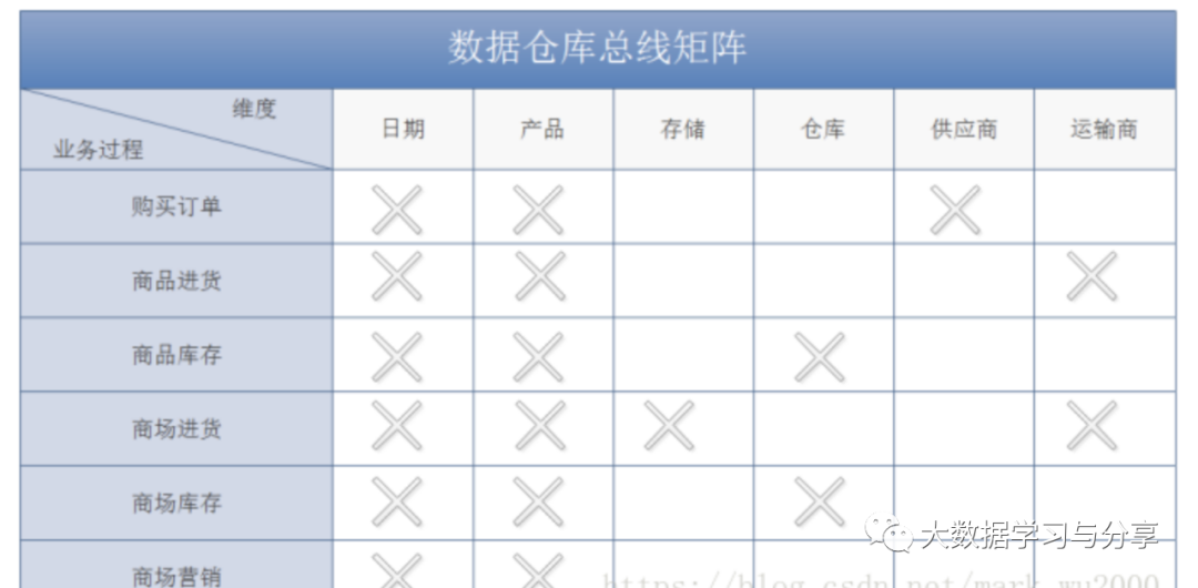 矩阵的每一行对应都对应机构中的一个业务过程,每一列都和一个业务维度相对应,用叉号填充显示的是和每一行相关的列。业务过程应该先从单个数据源系统开始,然后再进行多数据源的合并。
