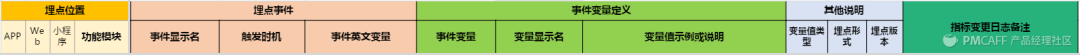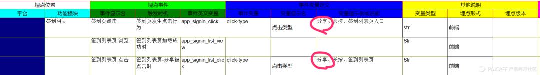 2)功能PM与数据产品经理(后称数据PM)做内部评审,评审目标是针对功能点梳理出与总埋点文档保持兼容、同时又可以拎出来后给到开发看的埋点清单;
