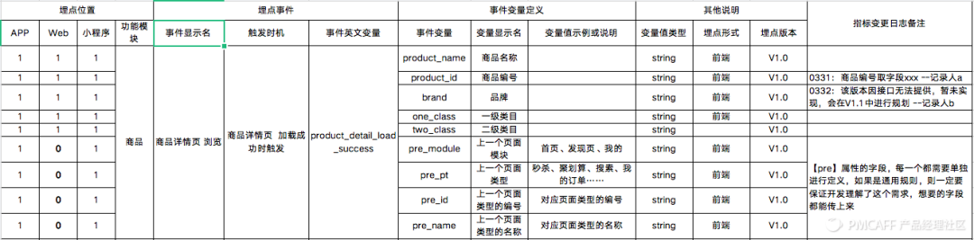 一款互联网产品每天产生的数据是庞大杂乱的,全部都存下来会占据硬盘空间,而且,不加定义和标记的数据也很难使用。因此,在初期的数据建设阶段,先要做的是定义想要的数据,告诉前端开发和后台的同事,你想要的数据有哪些,定义这些数据的字段包括但不限于以下字段:埋点位置:我司平台覆盖了APP、Web和小程序平台,其中有部分核心功能、页面在三个平台都有涉及(类似于电商平台的商品详情页),分开管理会造成指标冗余,因此对于多平台存在的核心指标,采用的是统一事件名定义,不同平台触发时,数据上报到同一个事件名上,通过平台类型(platform_type)进行拆分;功能模块:对应埋点所属的大功能板块,如【电子书】功能模块,会尽可能把属于电子书的埋点事件放到该模块进行管理。这里解释下没有向下拆解子功能模块的原因:对于我司业务,区分度比较高,功能模块+具体事件名就能够快速定位到想要的指标了。这点因公司而异;埋点事件:这个文档我是同时要给开发和运营的同事看的(分开维护的成本太高),对于运营同事来说,他们要关注的字段是下面这些:因此针对同一个埋点,至少要考虑的是以上这些字段。(更大平台的埋点字段会更多,欢迎交流)其中,比较难处理的是【触发时机】的准确定义和描述,举个例子,某页面的pv数据,触发时机定义成加载和加载成功,会是完全不同的数据;又比如,首页模块(也有叫楼层)浏览,模块长短不一,到何种深度会触发对应模块的浏览,需要定义时想清楚,与开发沟通实现细节,避免后期踩坑;事件变量定义:用来定义事件的参数,也可以理解为事件维度(也有一些实践是把事件表和维度表分别进行管理,我司实践是把二表合二为一)。该字段决定了事件的颗粒度,直接影响到事件下钻的颗粒度,对于数据PM来说,平台不同位置的事件抽象后,尽可能提取出公用事件,然后通过事件变量进行区分,能减少:指标冗余、指标管理工作、培训成本,以及使用者的学习成本。当然这里也并不完全执着于抽象公用性,对于数据PM和开发来说,指标约精简越好,便于理解和管理,但可能对于运营同事来说,学习和使用成本高企,数据产生了但无法最大化应用侧价值,那就得不偿失,所以需要平衡。举一例,电商产品,商品详情页的事件变量怎么设计,见下图:这里你可能会有疑问,如果是传一个【商品id】,其实也就可以通过【商品信息表】,把【商品名称】、【品牌】、【一二级类目】给查出来了,为什么还需要传?这里就涉及到指标管理与数据使用便捷性的权衡:如果不传,在使用的时候免不了要跨表联查,是比较影响使用效率的。在指标管理时常需要通过用空间换时间的方式,来保证数据能比较高效使用,最大化数据的价值。其他说明:变量值类型,比较常见的有:int、float、boole、string、timestamp;埋点形式,对于自己研发的数据采集系统,一般前端埋点和服务端埋点可以了,如果外采第三方数据采集服务,可能还会有全埋点(详细见上篇文章);埋点版本和日志,则是帮助你和开发快速回忆这个点的前世今生。如果这篇文章你只记住一句话,我希望是:好好记录指标备注及变更日志。这个工作能让你后面少踩太多坑了。以上,综合下来,以电商商详页举例,一个埋点事件最后的字段如下:2.1.2 埋点指标定义-用户表