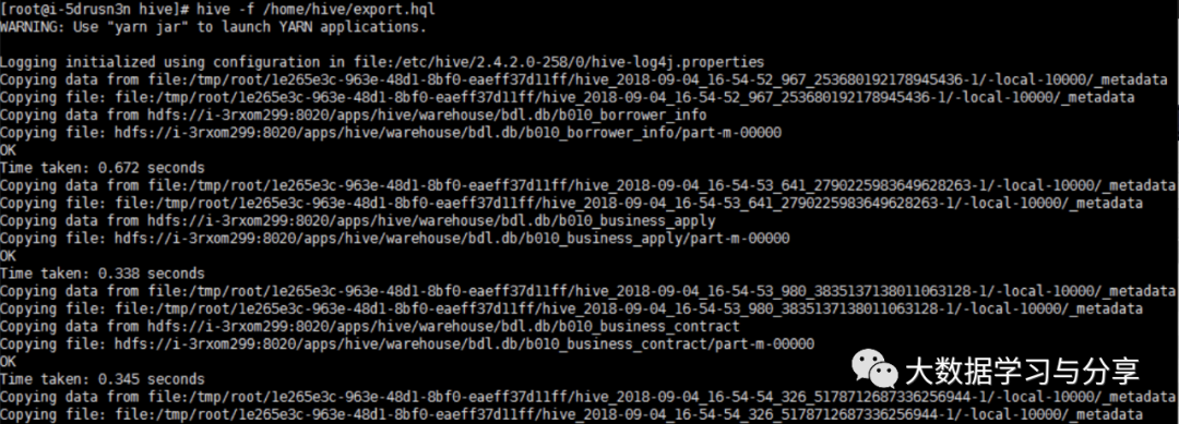## 将hives仓库中的数据统一导出到HDFS上的临时目录nohup hive --hivevar hive.security.authorization.enabled=false -f ~/export.hql>~/export.log 2>&1 &## 将HDFS临时文件下的数据get到本地nohup hdfs dfs -get tmp/hive_export data/ds10/>~/hdfs_get.log 2>&1 &## 如果本地空间不够,可以分批次将数据get到本地(中间用空格分隔,最后一个是本次导出的本地位置,一定是个目录)nohup hdfs dfs -get tmp/hive_export/表目录1 tmp/hive_export/表目录2 tmp/hive_export/表目录3 data/ds10/>~/hdfs_get.log 2>&1 &## 将本地数据发送到目标节点nohup scp -P端口号 -r data/ds10/* 用户@ip:/data/ds10.db/ >scp_ds10.log 2>&1 &