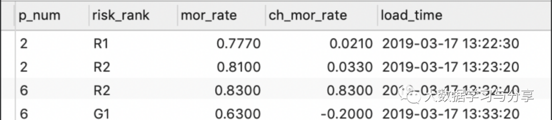 -- 在canal_test库下创建表CREATE TABLE `policy_cred` (p_num varchar(22) NOT NULL,policy_status varchar(2) DEFAULT NULL COMMENT '状态:0、1',mor_rate decimal(20,4) DEFAULT NULL,load_time datetime DEFAULT NULL,PRIMARY KEY (`p_num`)) ENGINE=InnoDB DEFAULT CHARSET=utf8;-- 在real_result库下创建表CREATE TABLE `real_risk` (p_num varchar(22) NOT NULL,risk_rank varchar(8) DEFAULT NULL COMMENT '等级:G1、R1、R2',mor_rate decimal(20,4) ,ch_mor_rate decimal(20,4),load_time datetime DEFAULT NULL) ENGINE=InnoDB DEFAULT CHARSET=utf8;