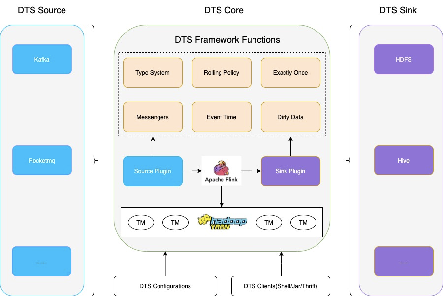 整体架构如下图所示,主要包括DTS(Data Transmission Service) Source、DTS Core、DTS Sink三大模块,具体功能如下: