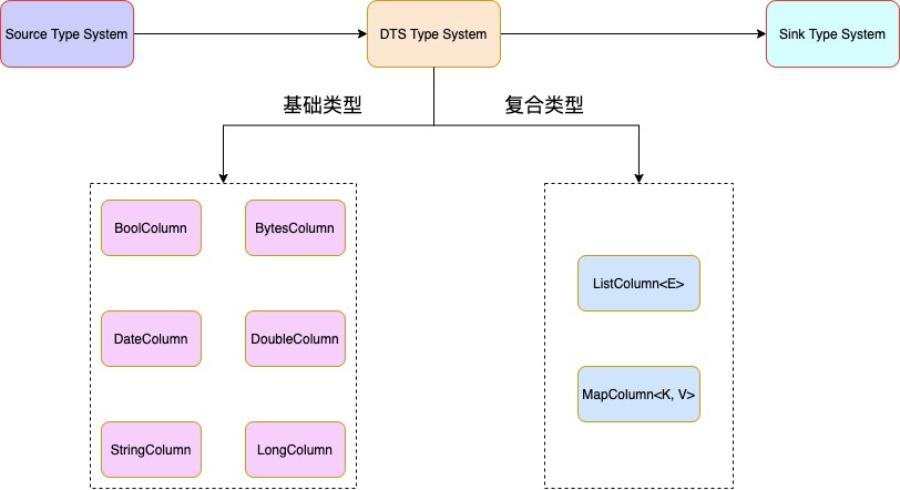 由于不同数据源支持的数据类型不一样,为了解决不同数据源间的数据同步以及不同类型转换兼容的问题,我们支持了DTS类型系统,DTS类型可细化为基础类型和复合类型,其中复合类型支持类型嵌套,具体转换流程如下: