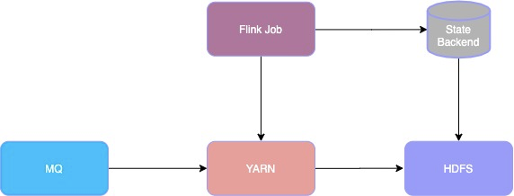 Flink Job运行在Yarn上,同时任务State Backend保存到HDFS,通过HDFS的多机房支持保障State Backend的多机房