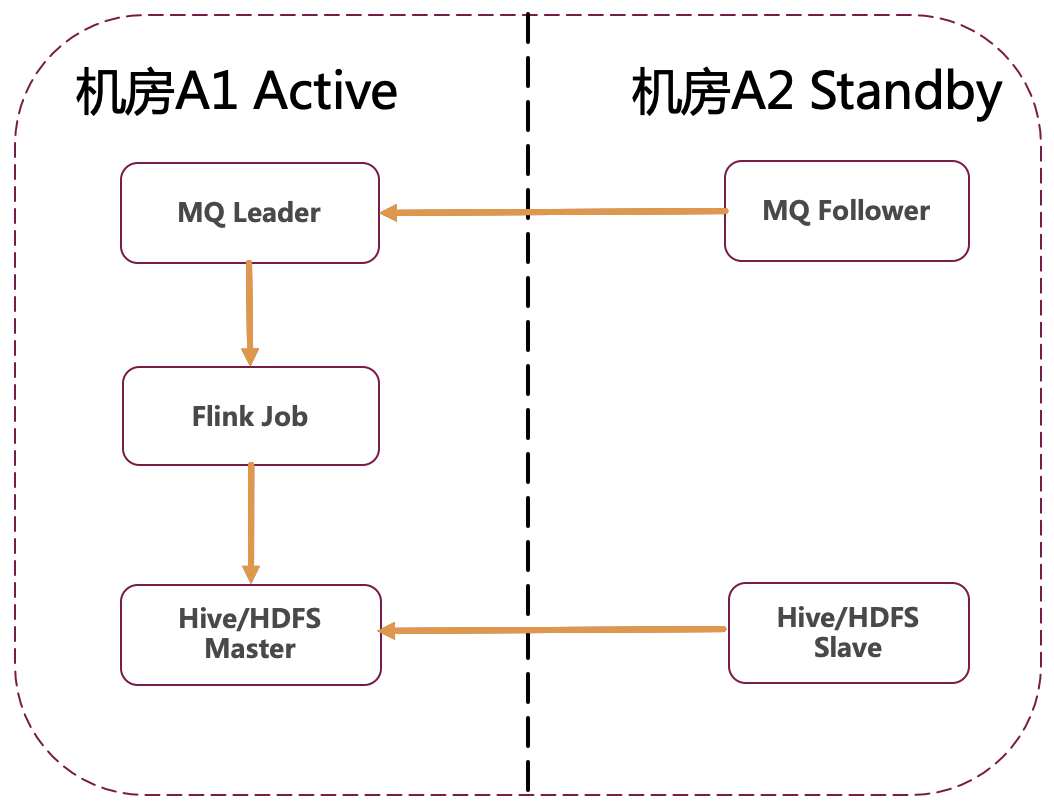 正常情况下,MQ Leader以及HDFS Master部署在主机房,并将数据同步到备机房。同时Flink Job运行在主机房,并将任务State写入到HDFS中,注意State也是多机房部署模式