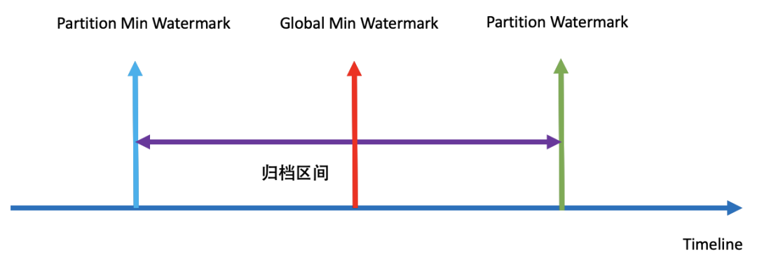 为了支持乱序的场景,会支持一个归档区间的设置,其中Global Min Watermark为全局最小归档时间,Partition Watermark为分区当前归档时间,Partition Min Watermark为分区最小归档时间,只有当事件时间满足以下条件时,才会进行归档: