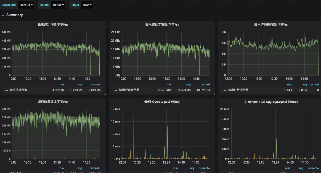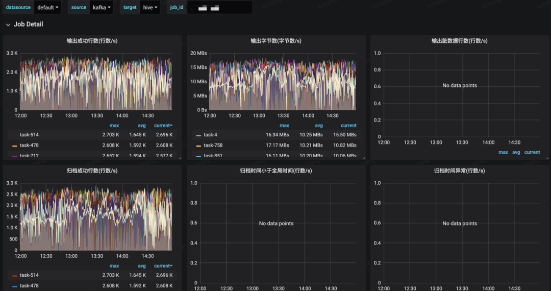 大盘指标覆盖全局指标以及单个Job指标,包括写入成功流量和QPS、写入Latency、写入失败流量和QPS、归档效果统计等,具体如下图所示: