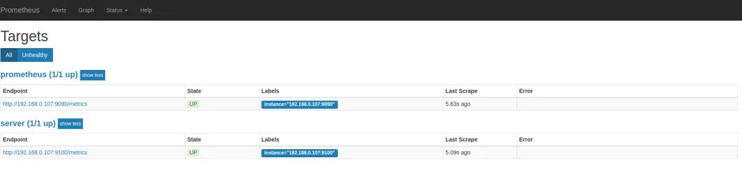 up{instance="192.168.0.107:9090",job="prometheus"} 1up{instance="192.168.0.108:9090",job="prometheus"} 1up{instance="192.168.0.107:9100",job="server"} 1up{instance="192.168.0.108:9104",job="mysql"} 0