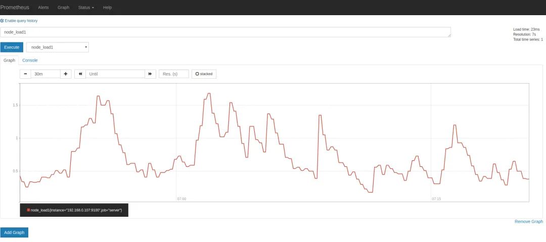 实际上Graph页面才是Prometheus最强大的功能,在这里我们可以使用Prometheus提供的一种特殊表达式来查询监控数据,这个表达式被称为PromQL(Prometheus Query Language)。通过PromQL不仅可以在Graph页面查询数据,而且还可以通过Prometheus提供的HTTP API来查询。查询的监控数据有列表和曲线图两种展现形式(对应上图中Console和Graph这两个标签)。