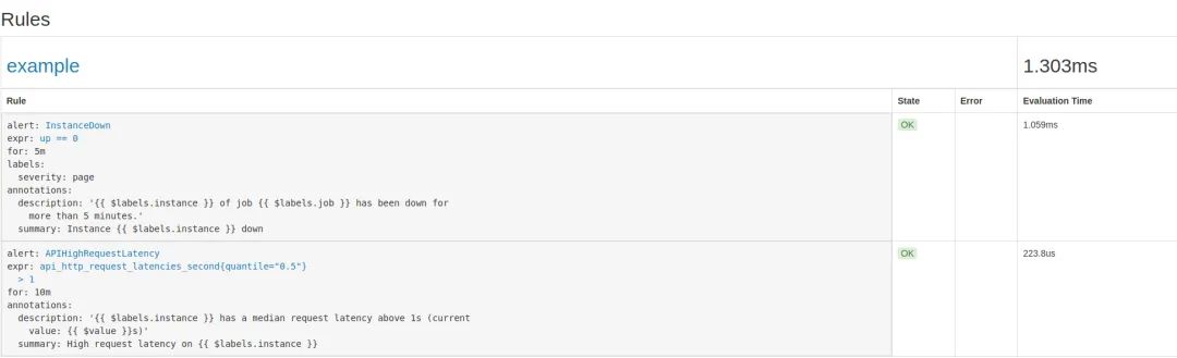 。顾名思义,InstanceDown表示当实例宕机时(up === 0)触发告警,APIHighRequestLatency表示有一半的API请求延迟大于1s时(api_http_request_latencies_second{quantile="0.5"} > 1)触发告警。配置好后,需要重启下Prometheus server,然后访问http://localhost:9090/rules