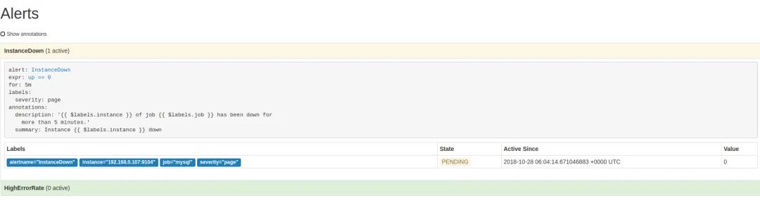 这里我们将一个实例停掉,可以看到有一条alert的状态是PENDING