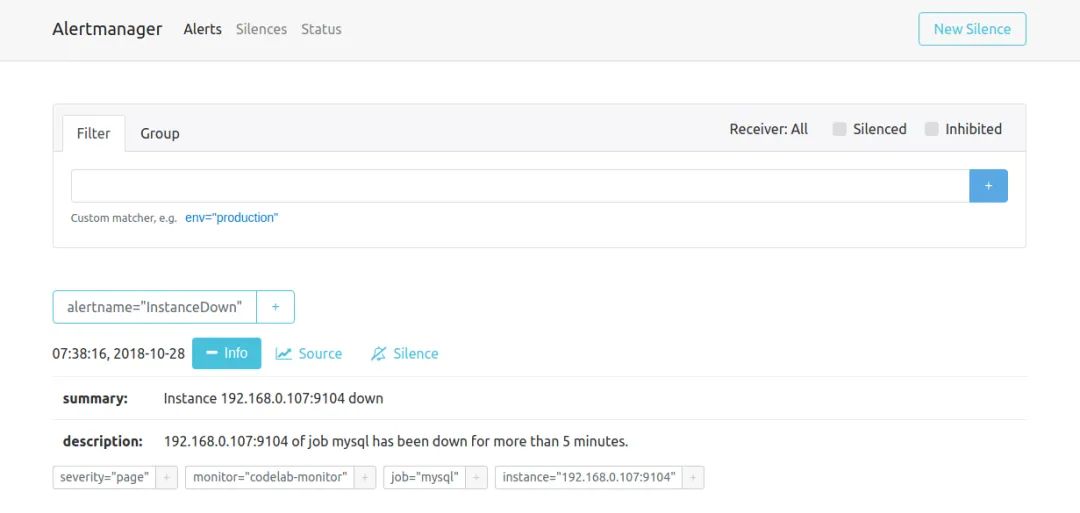 这个时候再访问Alertmanager,可以看到Alertmanager已经接收到告警了: