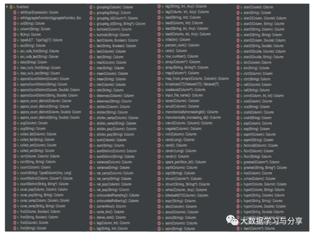 那么如果是在Spark SQL的DataFrame/DataSet的算子中调用,可以参考DataFrame/DataSet的算子以及org.apache.spark.sql.functions._下的函数: