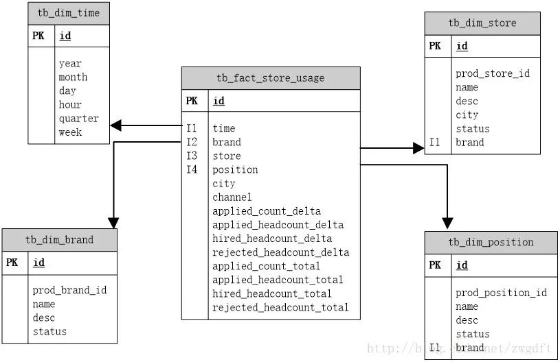 在品牌维度、门店维度、职位维度三张表中,都有prod_xxxx_id的字段,其值是产品业务数据库中相应数据的id,作用是为了与业务数据库中的信息进行同步。当业务数据库中的相关信息发生变化时,会通过ETL来更新数据仓库中的信息,因此我们需要这样的一个字段来进行唯一标识
