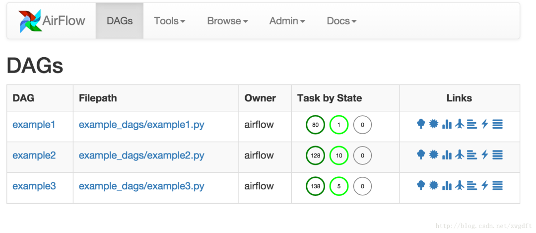 DAG(directed acyclic graphs),有向无环图,用来表示任务的依赖结构;Task表示一个具体的任务节点;Operator表示某个Task的执行体是什么,比如BashOperator是执行一个Bash脚本,PythonOperator是执行一段python代码等等。