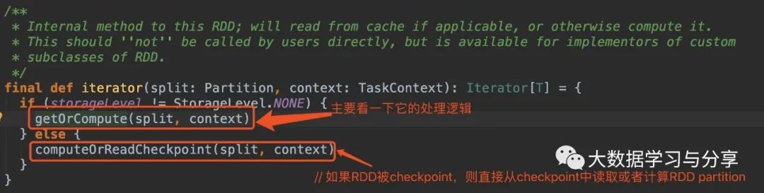 我们都知道RDD算子最终会被转化为shuffle map task和result task,这些task通过调用RDD的iterator方法获取对应partition数据,而这个iterator方法又会逐层调用父RDD的iterator方法获取数据(通过重写scala.collection.iterator的hasNext和next方法实现)。主要过程如下: