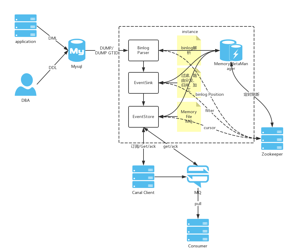 Canal server:为了减少对MySQL dump的请求,不同server上的instance要求同一时间只能有一个处于running状态,其他的处于standby状态。