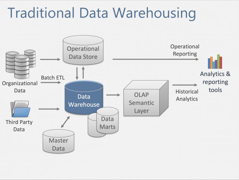 传统数仓大家都很熟悉,这里不做过多介绍,一般来说,传统数仓只能支持T+1天时效延迟的数据处理,数据处理过程以ETL为主,最终产出以报表为主。