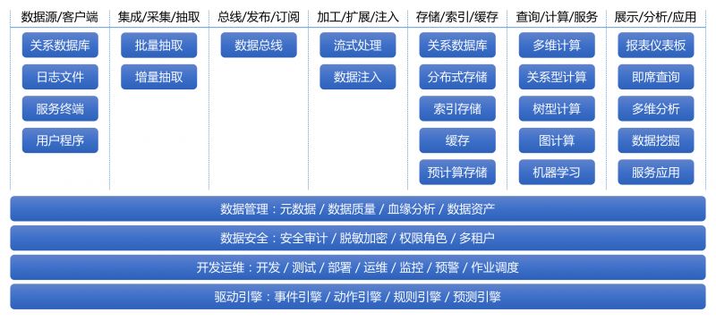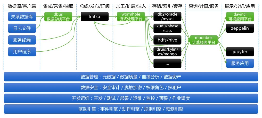 数据源、客户端,列举了大多数数据应用项目的常用数据源类型。 数据总线平台DBus,作为统一数据采集平台,负责对接各种数据源。DBus将数据以增量或全量方式抽取出来,并进行一些常规数据处理,最后将处理后的消息发布在Kafka上。 分布式消息系统Kafka,以分布式、高可用、高吞吐、可发布-订阅等能力,连接消息的生产者和消费者。 流式处理平台Wormhole,作为统一流式处理平台,负责流上处理和对接各种数据目标存储。Wormhole从Kafka消费消息,支持流上配置SQL方式实现流上数据处理逻辑,并支持配置化方式将数据以最终一致性(幂等)效果落入不同数据目标存储(Sink)中。 在数据计算存储层,RTDP架构选择开放技术组件选型,用户可以根据实际数据特性、计算模式、访问模式、数据量等信息选择合适的存储,解决具体数据项目问题。RTDP还支持同时选择多个不同数据存储,从而更灵活的支持不同项目需求。 计算服务平台Moonbox,作为统一计算服务平台,对异构数据存储端负责整合、计算下推优化、异构数据存储混算等(数据虚拟化技术),对数据展示和交互端负责收口统一元数据查询、统一数据计算和下发、统一数据查询语言(SQL)、统一数据服务接口等。 可视应用平台Davinci,作为统一数据可视化平台,以配置化方式支持各种数据可视化和交互需求,并可以整合其他数据应用以提供数据可视化部分需求解决方案,另外还支持不同数据从业人员在平台上协作完成各项日常数据应用。其他数据终端消费系统如数据开发平台Zeppelin、数据算法平台Jupyter等在本文不做介绍。 切面话题如数据管理、数据安全、开发运维、驱动引擎,可以通过对接DBus、Wormhole、Moonbox、Davinci的服务接口进行整合和二次开发,以支持端到端管控和治理需求。