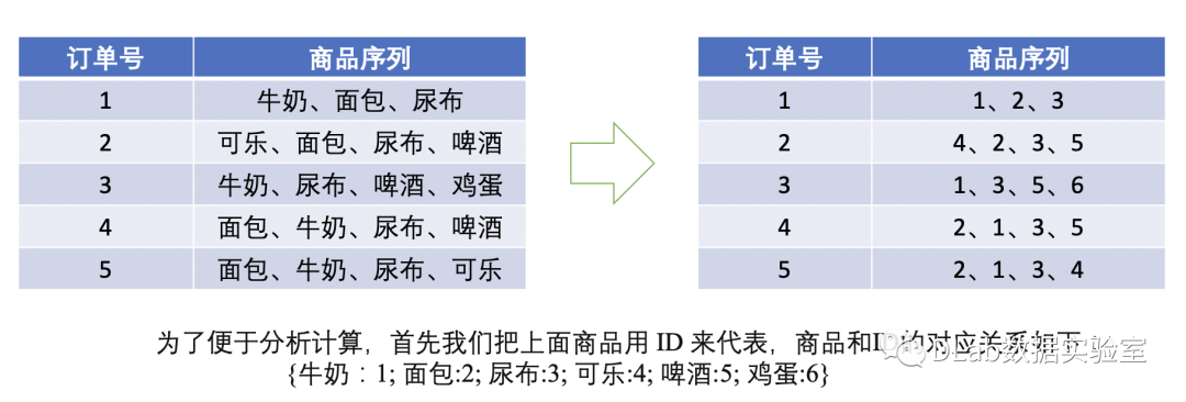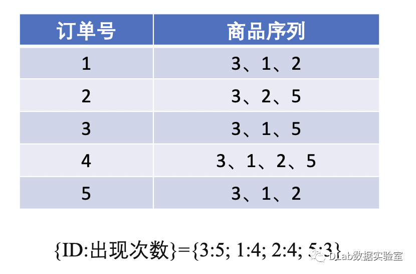 ID集合{1,2,3,5},所以在剔除ID=4和6后,对每条订单的商品序列按照商品出现的频率进行重新排序,得到如下: